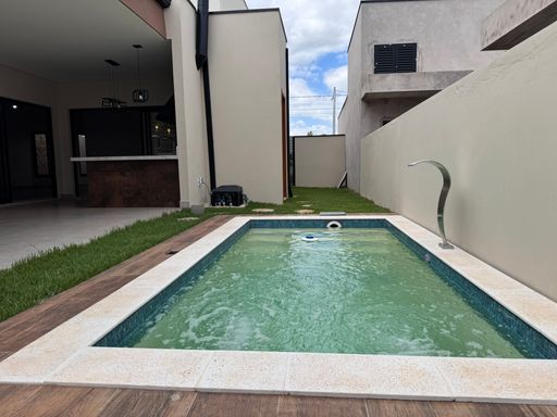 A área social se integra perfeitamente à área gourmet, criando um ambiente acolhedor e funcional, conectada à piscina, ideal para momentos de lazer e convivência. A residência oferece ainda duas vagas de garagem cobertas, garantindo conforto e segurança.