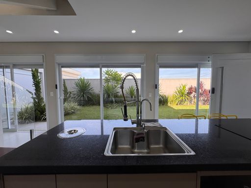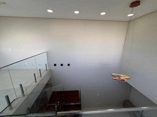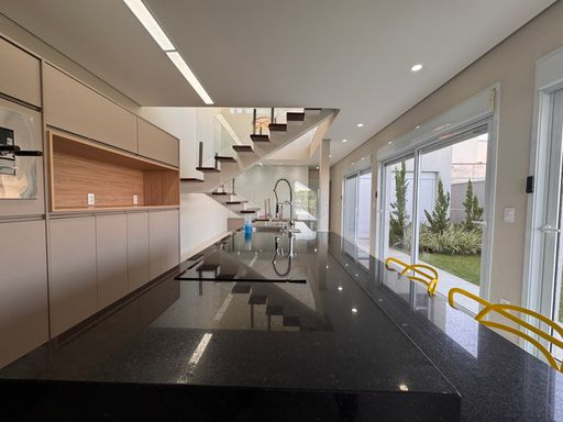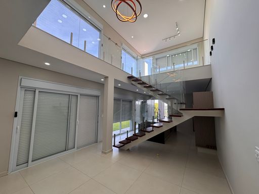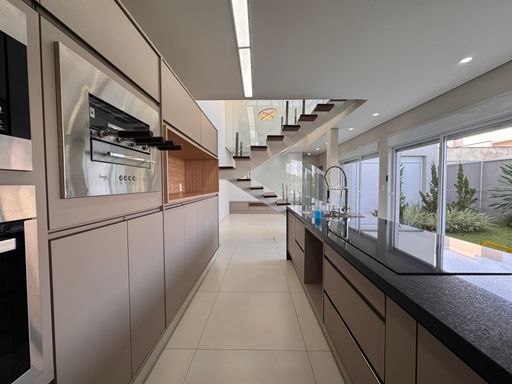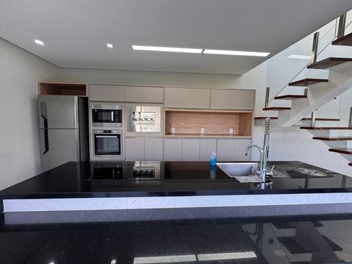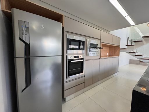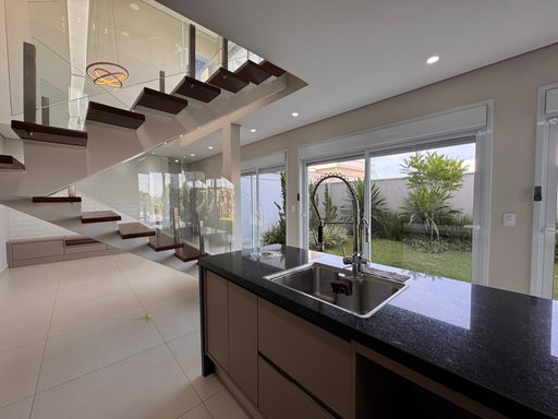 No pavimento térreo, os espaços são integrados e bem distribuídos, com destaque para a cozinha equipada com móveis planejados, perfeita para quem valoriza organização e praticidade. A escada com guarda-corpo em blindex traz um toque contemporâneo ao ambiente.