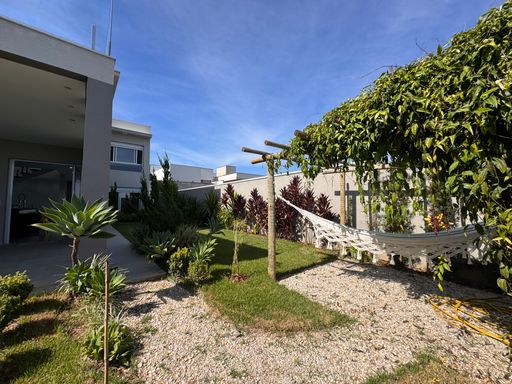 Na área externa, o imóvel oferece duas vagas de garagem cobertas e um agradável espaço com pergolado e rede, ideal para momentos de descanso e lazer.